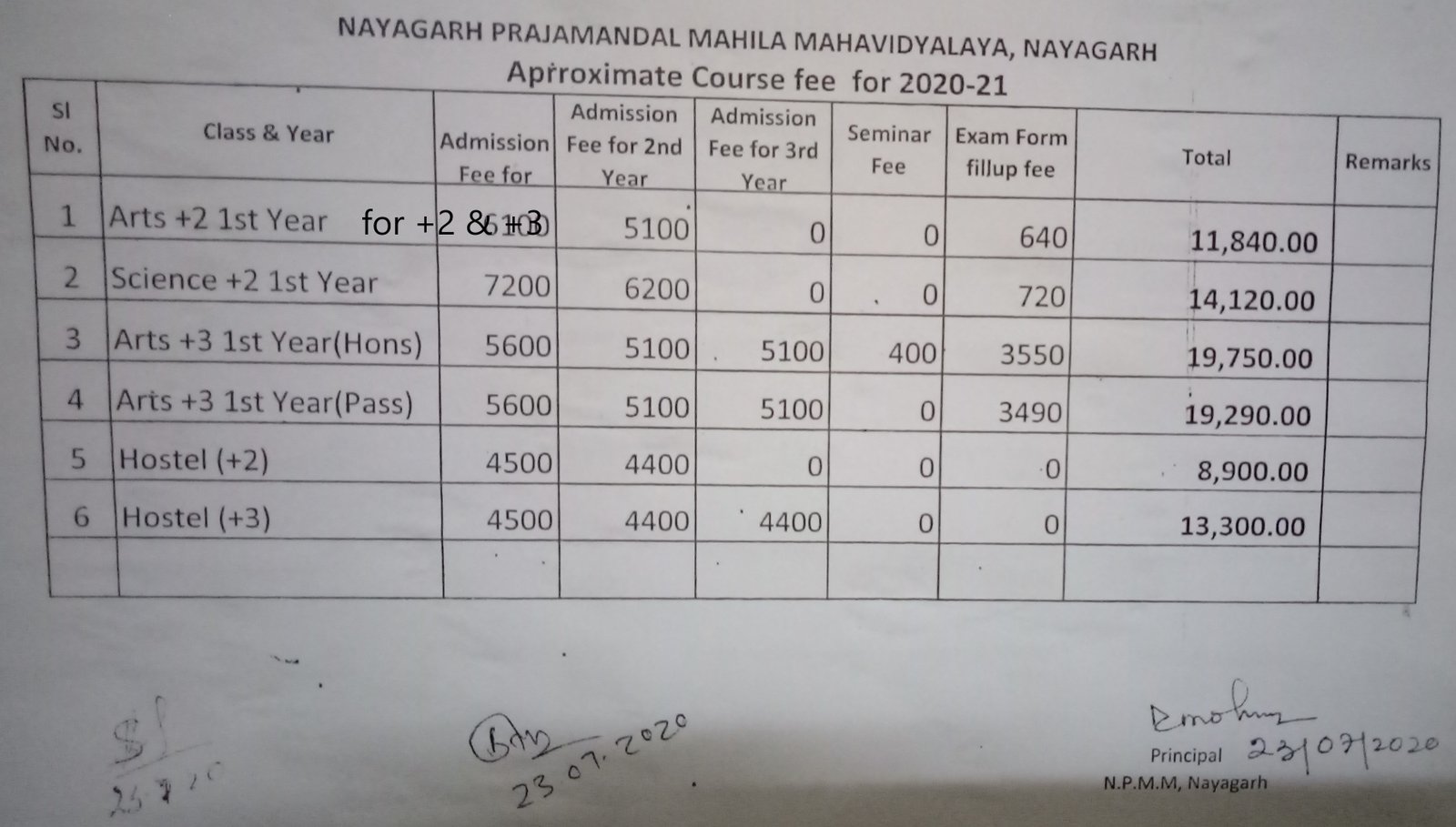 Fee-Structure For The Session 2020-2021 To Take admission In +2,1st year Arts,+2 1st Year Science,+3 1st Year Arts (Hons),+3 1st Year Pass as Follows:
